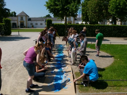 Im dritten Teil wurden in einer Werkstatt kleine weiße Boote gebastelt und an einem Stab mit Pinsel befestigt. Anschließend ging es nach draußen. Eine große Papierbahn wurde ausgelegt und mit blauer, grüner und weißer Farbe bespritzt. Die Schüler standen um das große Papier herum und mussten nun mit dem Pinsel stürmische Wellen malen. Dabei geriet das gebastelte Boot immer wieder in die Farbe, also in die stürmische See. Dabei hat und der Museumspädagoge photographiert. Die Aktion hat Spaß gemacht.