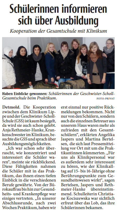 Schülerinnen informieren sich über Ausbildung – Kooperation der Gesamtschule mit Klinikum