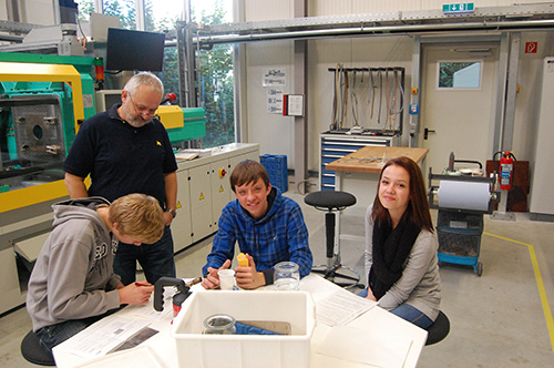 Angefangen von der einfachen Dichtebestimmung verschiedener Kunststoffe bis hin zur Funktionsweise von modernen Spritzgussmaschinen und ihrer anpassbaren Werkzeuge können die Schüler hier zukunftsträchtige Hochtechnologie erfahren. „Unter Werkzeug verstehen die Jugendlichen einen Hammer oder einen Schraubendreher. Ein Werkzeug für eine Spritzgussmaschine ist etwas völlig anderes“, führt Dozent Frank Wessel-Kersting schmunzelnd aus. Und Thomas Mahlmann von zdi-Zentrum Lippe.MINT führt aus: „Dieser zweite Teil führt schon intensiver in die Berufswelt des Verfahrensmechanikers ein. Aber so, wie die Schüler ihr Interesse hier zeigen, wird auch dieser intensivere Teil gut klappen“.