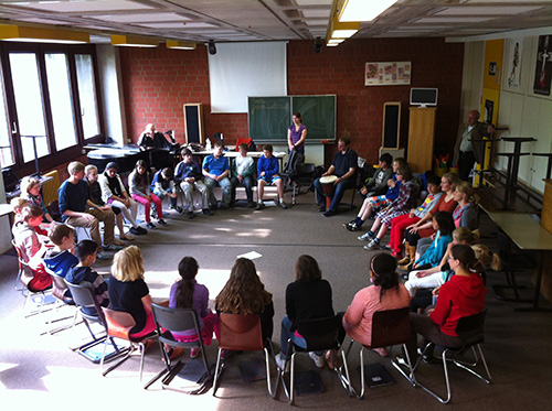 Nach einem kurzen Warm-Up ging es in mehrere Kleingruppen. Dort haben die Schüler aus vier Rhythmuskarten eigene Gordon-Rhythmen zusammengestellt und dann eingeprobt. Alle Schüler hatten die gleichen Karten, erarbeiteten aber durch die unterschiedliche Reihenfolge jeweils unterschiedlich klingende Rhythmen.
