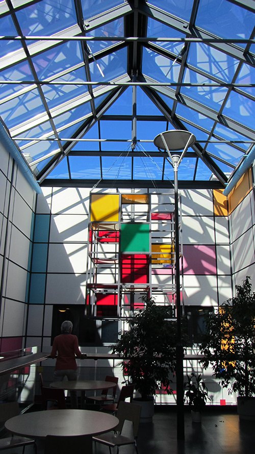 Ein Teil des Innenbereiches der Schule ist hell und farbig gestaltet und bietet Schülerinnen und Schülern die Möglichkeit, sich dort allein oder in kleinen Gruppen an Tischen zum Arbeiten oder Ausruhen zu verabreden.