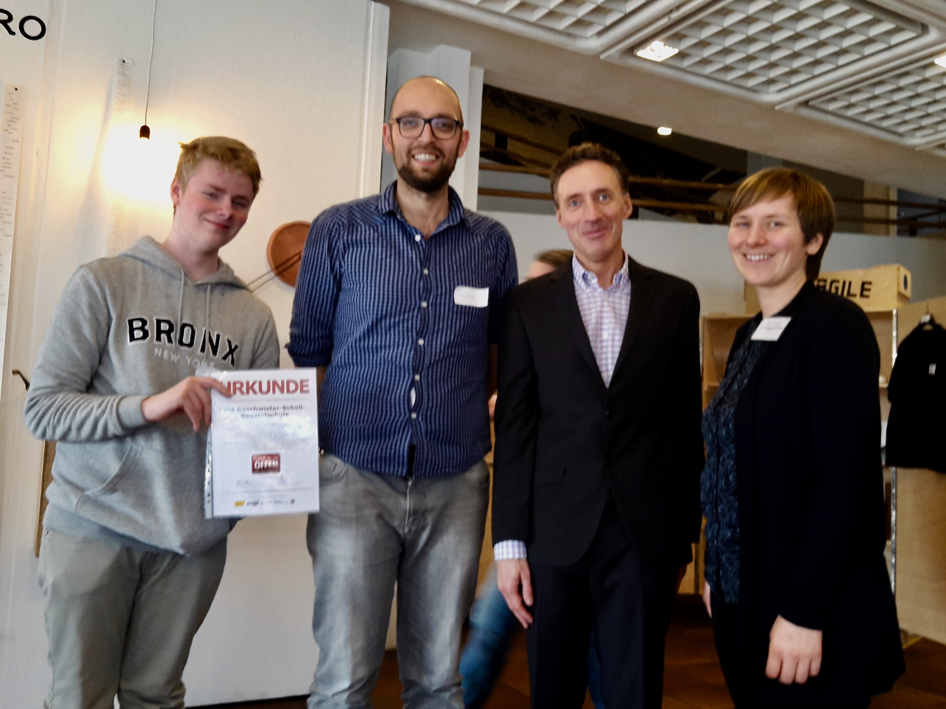 Im Rahmen dieser Veranstaltung bekamen die Vertreter*innen der Schule vom Landeskoordinator „Schule der Vielfalt“ Frank Pohl und einer Vertreterin der Antidiskriminierungsstelle des Bundes die Urkunde für die Leistungen der Schule in der Arbeit gegen Diskriminierung überreicht.