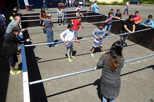 Der zweite Höhepunkt war der Menschenkicker, der während der ganzen Zeit von vielen Schülerinnen und Schüler umlagert war. Am Nachmittag vor dem Halbfinale der EM bewiesen unsere Jungen und Mädchen mindestens genau so viel Ballgeschicklichkeit wie Jogis Jungens.