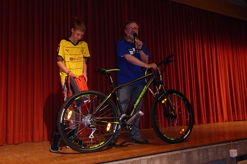 Der erste Höhepunkt der Veranstaltung war die spannende Preisverleihung aus der Tombola, die Herr Koch, unser Mountain-Biker unter den Lehrern, organisiert hatte: Für zwei Euro konnte man ein Los kaufen; der Hauptpreis war ein tolles, neues Fahrrad im Wert von über 500.- Euro, das Leonard Bergen aus der 6e gewann. „Ich hatte mir zum Geburtstag ein neues Fahrrad gewünscht, aber keins bekommen. Jetzt habe ich eins!“, freute sich Leonard.