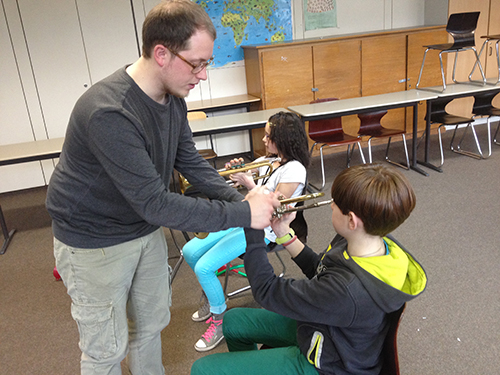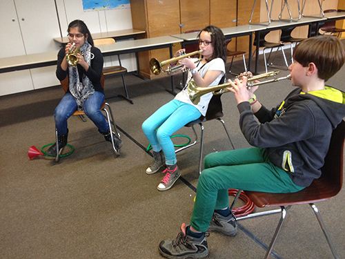 Herr Kaiser nahm sich geduldig Zeit für jeden Schüler und hatte viele hilfreiche Tipps parat, so dass fast jeder einen schönen Ton aus der Trompete zaubern konnte. Einige Schülerinnen und Schüler zeigten großes Talent für das Instrument und konnten gleich mehrere Naturtöne mit einem richtig guten Klang spielen.