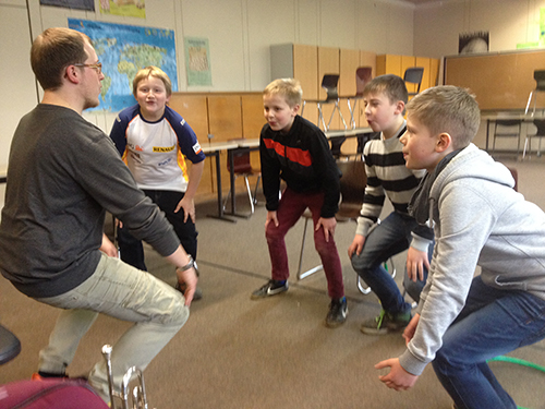 Während seiner richtig spannenden Instrumentenvorstellung durften die Schüler aktiv mitmachen (Atemübungen und allerlei „merkwürdige Lippengeräusche“). Besonders beeindruckend waren auch die Musikstücke, die Herr Kaiser vorspielte: von Joseph Haydn über „My Way“ von Frank Sinatra bis hin zu einer kleinen live-Jazzsession (Cantaloupe Island) zusammen mit unserem Musiklehrer Martin Rudkowski am Klavier war alles dabei, um die vielen Klangfarben der Trompete ausdrucksstark vorzutragen!