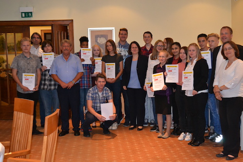 Die Zehntklässler erhalten im Beisein der Sponsorenvertreter Frau Grabbe (Sparkasse), Frau Heins (Agentur für Arbeit), Herrn Terwonne (Stiftung für Lippe) und des Schulleiters Herrn Trappe im Anschluss an das „Benimmtraining“ die Zertifikate des Projekts „Fit for Job“ von Tobias Forth.