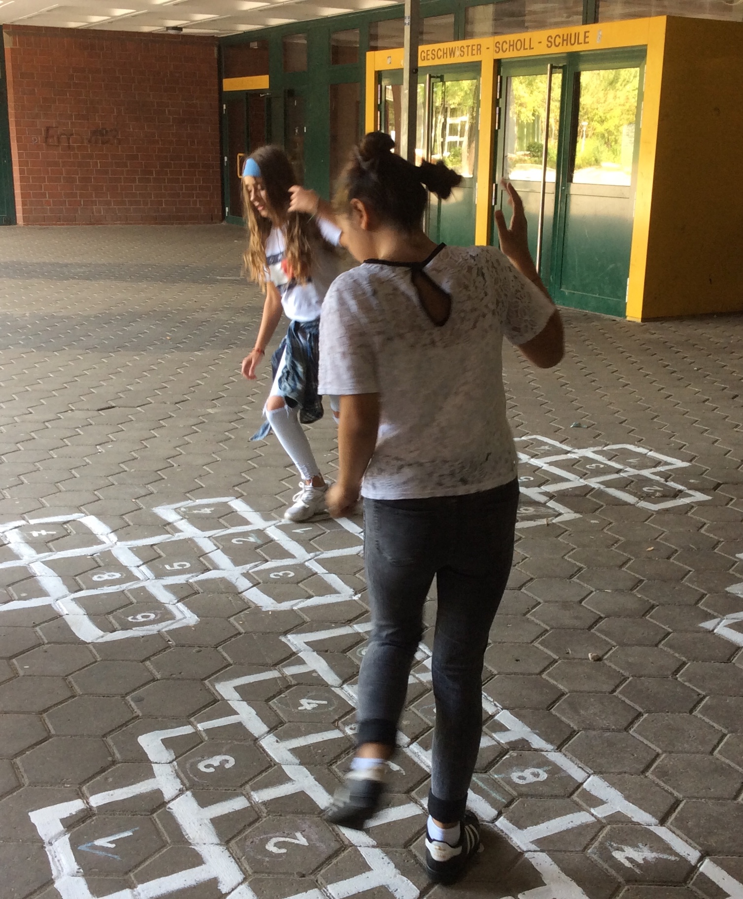Unsere Schülerinnen Ariana Béla und Hivron Cakir (7e) beim Erspringen von Aufgaben und Ergebnissen am Hüpfkästchen.