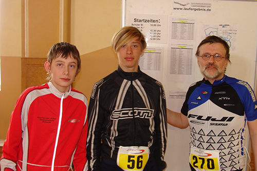 Zusammen mit ihren Lehrern Reinhard Schiffer und Norbert Koch machten sich Nils Winkler und Maximilian Jung mit ihren Mountainbikes am frühen Sonntag morgen auf nach Lage. Dort richtete der Sportverein „TriTeamLage“ zum 10. Mal den Crossduathlon im Stadtwald aus. Die Schüler mussten folgende Strecken bewältigen: 1km Waldlauf, 4 km Mountainbike fahren, 1km Waldlauf.