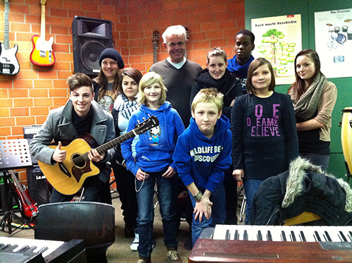 Alle freuen sich über die neue Yamaha-Gitarre, v.l.: Keenan Back, Ian Schultz, Silan Hasan, Meike Freitag, Uwe Pohl, Fabian Mai, Amie Covill, Japhet Luntadila, Lara Gehrke und Lea Selina Buhr