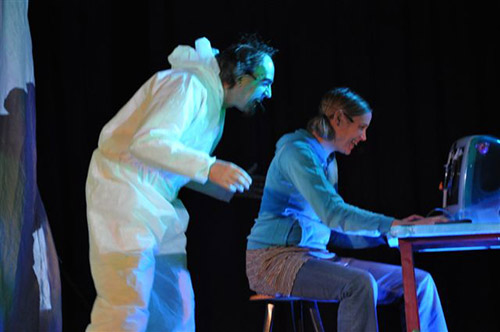 Einflüsterung aus der (S)chattenwelt. Schülerin Liz (Ines Bollmeyer, PISAKtheater) cybermobbt auf Anweisung ihres "teuflichen Schattens" (Bernd Sprenger, PISAKtheater) ihre Freundin Yvonne. | Foto: Elisabeth Janke