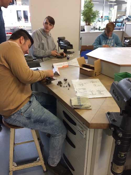 18 SchülerInnen des Jahrgangs 8 nahmen auch in diesem Jahr wieder an einem MINT-Tag in der Ausbildungswerkstatt der Firma Weidmüller teil. Nach einer herzlichen Begrüßung und einem Einstiegsreferat zum Thema Industrie 4.0 und Ausbildung wurden die SchülerInnen in drei Gruppen eingeteilt.