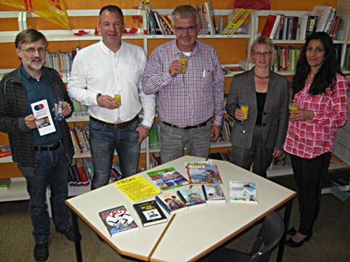 Die Schulbibliothek der Geschwister Scholl Gesamtschule erhält von der Sparda Bank Stiftung Hannover Fördermittel in Höhe von 800,- € für die Neuanschaffung von Büchern und Zeitschriftenabos. Am Donnerstag fand eine kleine Feierstunde zur Übergabe in den Räumen der Bibliothek statt. Bibliotheksleiterin Frau Ewert, Schulleiter Herr Trappe, Fördervereinsvorsitzender Herr Pohl und Lehrer Norbert Koch erläuterten der Leiterin der Detmolder Filiale der Spardabank, Frau Schlink-Böger, das Konzept der Bibliothek.