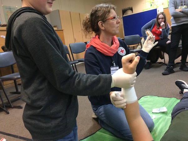Durch das Deutsche Rote Kreuz wurden an einem Samstag 12 SchülerInnen der Geschwister-Scholl-Gesamtschule in der Ersten Hilfe unterwiesen und zu „Ersthelfern“ ausgebildet. Neben theoretischem Hintergrundwissen wird dabei immer sehr viel Wert auf die Praxis gelegt. Daher ist so ein Ausbildungstag immer sehr kurzweilig. In Rollenspielen werden Situationen eingeübt, Wunden werden versorgt, Verbände angelegt, Personen aus Autos geborgen oder die stabile Seitenlage einstudiert.