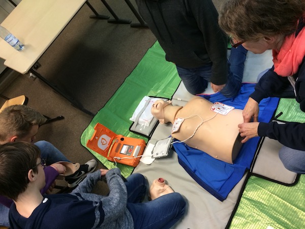 Besonders interessant war dieses Jahr die Übung mit dem Defibrillator. Entgegen mancher Einschätzung macht das Gerät von alleine so rein gar nichts, es muss richtig bedient werden. Bei Herzkammerflimmern kann der Defibrillator durch Elektroschocks das Herz wieder zu einem geregelten Herzschlag bringen. Schlägt das Herz aber gar nicht mehr, muss man im Ernstfall die Herzdruckmassage und die künstliche Beatmung schon selber durchführen.