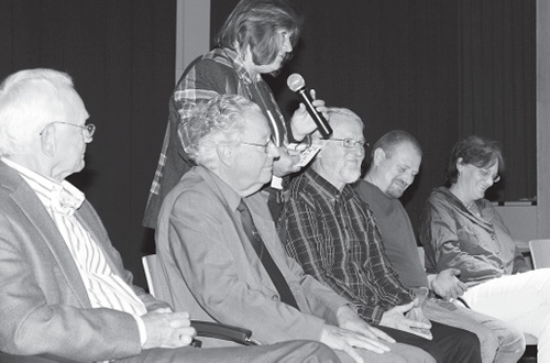 Sprachen mit Monika Bösing (stehend) über die bewegte Geschichte der Gesamtschule: Friedel Uthe, Christian Weyert, Friedhelm Rakowsky, Jens Renner und Micheline Prüter-Müller. FOTO: BECKSCHÄFER