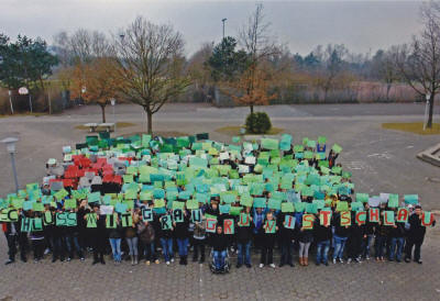Um dieses Ziel zu erreichen, haben sich die Klassen 7a/b/c/d/e, die Klassen 8a/c/d, 9c/f und der Kunstkurs Klasse 10 unter Leitung von Frau Leßmann etwas Besonderes einfallen lassen. Im Rahmen des Schülerwettbewerbs „Unser Schulhof – wir sehen rot malten die Schülerinnen und Schüler grüne Plakate und stellten sich auf den grauen Schulhof, um diesen bunter zu machen und daran zu erinnern, was eigentlich fehlt: Hecken, kleine Hügel, Sitzgelegenheiten aus Naturmaterialien, Klettergerüste, Balancierbalken und und und.