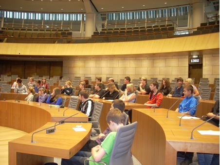 Ein großer heller Saal, blitzblanke Plenarsaaltische aus edlem Holz, ein sauberer Teppichboden, bequeme makellose Stühle. „Können wir nicht solche Stühle bei uns im Klassenraum haben? Dann würden wir auch viel besser aufpassen!“ Unterrichten könnte so einfach sein…
