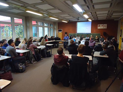 Danach stellten sich 8 Studierende mit Migrationshintergrund aus seinem Projekt vor. Diese Studentinnen und Studenten informierten unsere Schülerinnen und Schüler über Themen wie: Übergang Abi-Studium, formale Dinge des studentischen Lebens wie Noten, Klausuren und Hausarbeiten, aber auch über die Frage „Wie finanziere ich mein Studium?“.